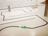 ロボットは全て、黒いラインを読み取りながら進行していくというプログラミングが必要で、いたるところに「被災者」を模した色のついたシールが貼ってあります。